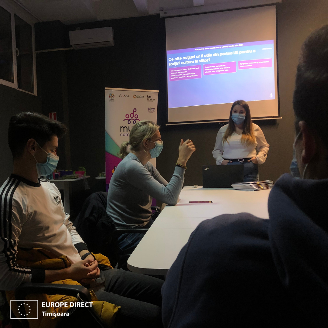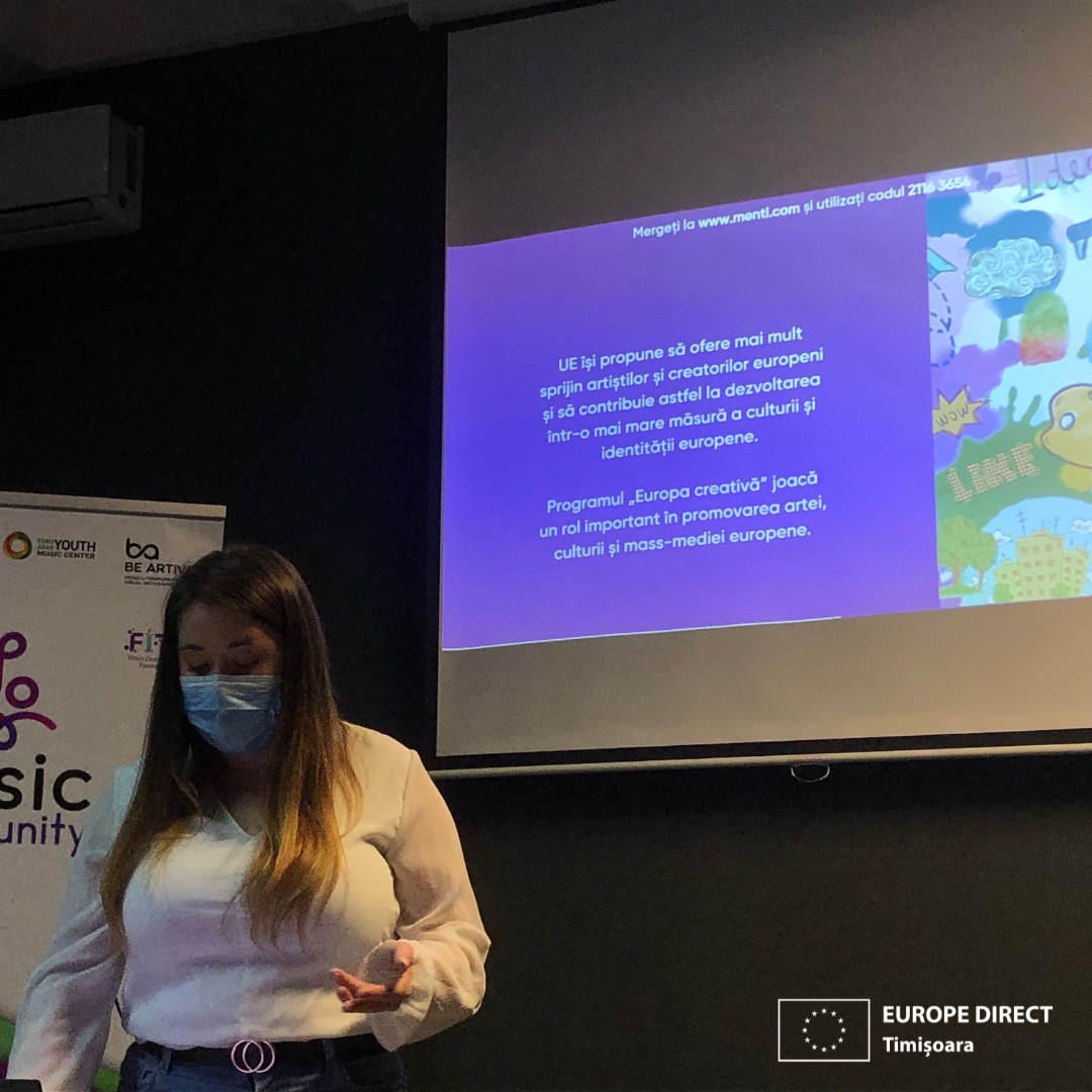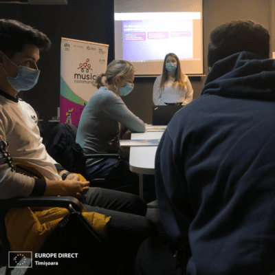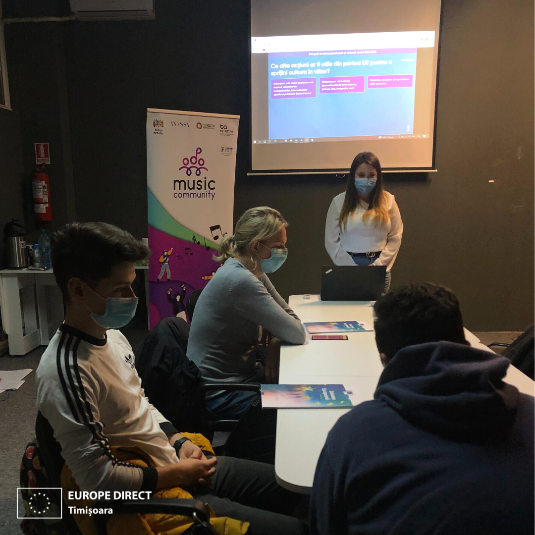 EUROPE DIRECT Timișoara a prezentat acțiunile Uniunii privind cultura la unul dintre workshopurile proiectului Music Community, care sprijină tinerii să se implice și să se conecteze prin muzică, la inițiativa a 4 organizații din Europa: Tribul Artistic (ROMÂNIA), Anassa Productions (FRANȚA), EAYMC (CIPRU) și BE ARTIVE (GRECIA). Proiectul este finanțat prin Programul Erasmus+.